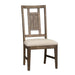 Details delight with the Artisan Prairie optional rectangular table set. Crafted of rubberwood solids with split heart white oak veneers, this set features a wire brushed aged oak finish with dusty wax and consists of the rectangular leg table and four lattice back side chairs. The table has a planked top with canted corners and features a self-storing removable 18” leaf and is anchored by tapered legs. The chairs have a grid overlay design on the back and have a padded upholstered seat in a cream chenille fabric. They have tapered legs and nylon chair glides to protect your flooring. Create a natural feeling in your home with the Artisan Prairie collection.