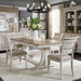 Wow family and friends with the Farmhouse Reimagined optional five-piece trestle table set. Crafted of pine and poplar solids with hickory and pine veneers, this set features an antique white finish with heavy wire brush distressing and a chestnut top and consists of the trestle table and four ladder back upholstered side chairs. The trestle table features an 18” removable leaf on an easy glide track system for easy opening and is anchored by beautifully curved legs with a center trestle. The ladder back side chairs have a padded upholstered seat in a khaki linen fabric with tapered legs and nylon chair glides to protect your flooring. Farmhouse Reimagined offers looks that easily work in today’s homes with style uncompromised and comfort abound.