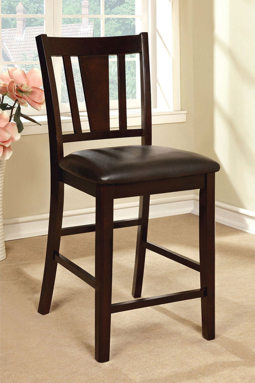 Furniture of AmericaIn stockPadded leatherette chairs accent this square counter height table finished in espresso. A perfect addition to a small dining area or kitchen.Produc...