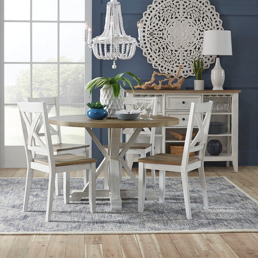 Liberty FurnitureIn stockReinvent your style with the Lakeshore five-piece pedestal table set. Crafted of rubberwood solids with pine veneers, this set features a white fi...