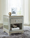 Glamorous, chic and sophisticated. This accent table set is made of solid wood with a metallic silvertone finish, with inset beveled mirror panels and inset drawer pulls adorned with faux crystals. This set is a stunning addition to your contemporary decor.