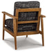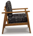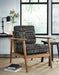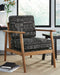 This accent chair offers a perfect blend of style and comfort for your living space. A charcoal printed upholstered seat and back complement the design and invite you to sit back and relax.