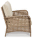 Bring a beach house look and feel to your outdoor living space with this seating ensemble. Made with driftwood-hued resin wicker over a powder coated steel frame, it features foam cushions wrapped in a high-performance Nuvella® fabric that is colorfast and easy to clean. With this cool and casual outdoor furniture set, every day feels like a day at the beach.