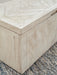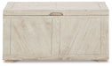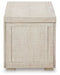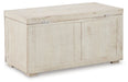 Perfect for storing throw blankets or other linens, this storage trunk is a stylish space-saving solution. Its distressed white finish paired with the diamond pattern top create an irresistible vintage vibe. Simply open the hinged top for a versatile storage space.