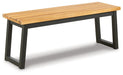 Bring an uptown feel to an outdoor space with this outdoor furniture set. Designed to comfortably seat four, this ultra-cool outdoor dining table and bench set a new standard in outdoor living. The tabletop and bench seats are richly crafted of acacia wood with wonderful tonal variation. Tubular steel legs are sleek, sturdy and slightly canted for an interesting angled effect.