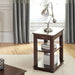 Enhance your traditional style space with the Wallace chair side table. Crafted of rubberwood solids and birch veneers, this piece features a dark toffee finish, a fancy face veneer top, two shelves for additional storage, a full extension black laminate tray ideal for placing your drinks, accented with an appealing satin nickel bar pull hardware. This charming side table would be a great addition to your home.