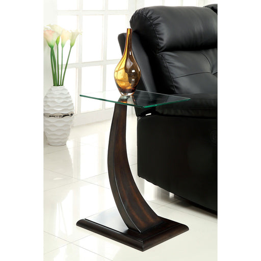 Furniture of AmericaIn stockThis side table showcases a stunning curved panel base design along with 8mm tempered glass.Product Features Contemporary Dark Walnut Tempered Glas...