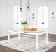 Casual style with substance. This dining table's two-tone finish of classic white and butcher block oak veneer adds a relaxed vibe to a delicious design. Convenient side drawers maximize space, while black bar pulls exude modern farmhouse vibes. This charmingly curated piece is spacious enough to accommodate work or play in your informal dining room or eat-in kitchen.