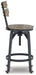 Delight in the effortless two-tone look of this swivel barstool. Dark iron-tone metal and distressed brown wood pair for a rustic look with modern sensibility. A ladderback design brings additional charm. The adjustable height, swivel motion and footrest allow you to find your ideal comfort position.