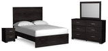 View full detailsWith its clean-lined look and modern attitude, this bedroom package is a fresh style awakening. A warm charcoal hue over replicated oak grain easil...