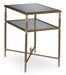 This end table gives traditional design a wonderful sense of relevance. Its details, which include embellished legs and a stretcher with a decorative center finial, are timeless classics. The aged goldtone coloration is the essence of relaxed elegance. An underlying shelf adds style, substance and functionality.