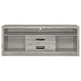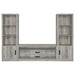 Design the entertainment mecca you've always imagined with this three-piece media center. Including a central TV stand and two media towers, the set delivers simplicity of silhouette with plenty of storage options to accommodate your needs. Gray driftwood finish laminate surfaces are durable and resistant to scratches and denting, offering impressive durability. The TV stand offers two open shelves and two drawers, each with contrasting hardware that adds a pop of dimension. The media tower each add three upper shelves and a lower cabinet, creating the perfect blend of storage and display spaces to bring personality to your welcoming living room.