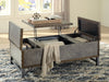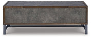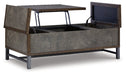 Reinvented for the here and now, this lift-top coffee table rocks vintage industrial design with a traditional vibe. Its metal accent trim and bronze-tone metal base frame are ready to embrace the modern demands of everyday life. Two spacious storage bins provide additional storage, while the center lift top transforms into a casual work center or extra dining space when needed.