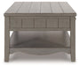 Put your love of European farmhouse styling on display. Finished with an antiqued gray chipped paint effect for an authentic vintage look, this coffee table is loaded with character. Two drawers and an open display shelf allow for storage and easy access to books, beverages and more.