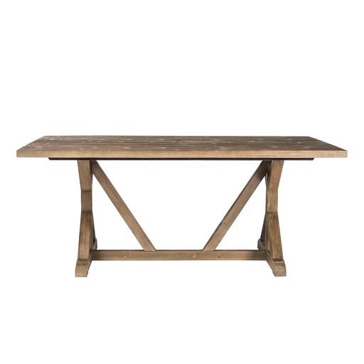 Gather around the Carolina Lakes trestle table. Crafted of Chinese Fir solids and veneers and finished in a wire brushed weatherd gray. The fixed ...