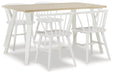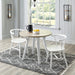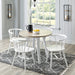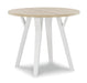 Bring light to your dining area with the clean lines and bright two-tone finish of this dining package. The round dining table, with stylized saber legs in a white finish, matches the spindle-back chairs for beautiful simplicity. The table’s melamine top, in a light tan color, provides additional durability, marrying minimalism with big style for a delightful combination.