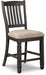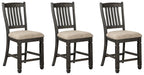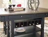 Set your sights on this counter-height dining table set. This high-profile table beautifully suits your storage needs—base includes two open shelves, four drawers and a built-in wine rack. Heavily textured black and oak finish is trend-right urban farmhouse style. Set includes six upholstered bar stools with tapered legs for a winning combination.