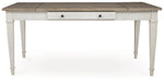 Set the scene for coastal chic or modern farmhouse living with this dining room table. Clean-lined, simply striking table doubles the charm with a brown tone top with plank effect, paired with a grayish white base with rub through effect for timeworn appeal. Multi-functional dining table features two convenient side drawers and a storage bin on each end for maximum use of space. Styled to comfortably seat six, this table makes room for one and all.