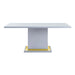 The sleek clean-lined table Gaines dining table offers subtle a hint of glam, the base offers a touch of gold to enhance the textured vertical lined pedestal. The white high gloss finish reflects light and makes any dining space appear larger and grander. Ample enough to showcase an impressive spread for all your guests to enjoy.