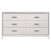 Classic design with touches of modern aspects makes this Haiden Dresser ideal for any bedroom. The piece offers a rectangular tabletop and six storage drawers for displaying or organizing. It also features a glamorous shimmering silver accent trim that adds richness to design. The drawer handles with the same shimmering silver tie them all together to create a cohesive look. The white finish makes it easy to fit into already existing decor.