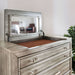In addition to stunning carved details and felt-lined top drawers, this transitional style chest comes with conveniences as well, such as a hidden lift-top jewelry storage. Sleek silver tone handles sparkle against the weathered gray finish that will beautify any bedroom.