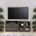 Curate your living space for the ultimate gaming and entertainment experience. The gray finished entertainment TV stand creates cool tones that instill a relaxing ambiance. Intricate wavy designs create texturized patterns, adding chic edgy detailing. Simply organize with glass paneled cabinets and complete the aesthetic with your TV perfectly centered for a seamless entertainment experience.
