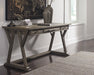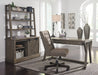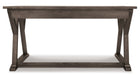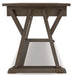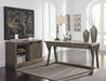Work the latest trend in casual farmhouse living with this home office desk. Elements include distinctive cross brace with stretcher styling and a wire brushed gray-brown finish that’s so easy on the eyes. Making this home office desk all the more unique: a faux bluestone inset on the desk top for a mixed media twist. Three smooth-gliding drawers with brushed nickel-tone pulls help keep you organized and on task.