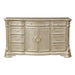 Traditional elements of Old World European styling are blended to create the look of the Antoinetta Collection. Acanthus leaf motif as well as bead and heavily carved moldings serve as the initial draw to the traditional design. Canted pilasters, marble tops, and classic bale hardware further accent the dresser. Birch veneer is highlighted by a champagne finish with accentuating tipping.