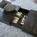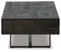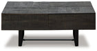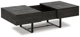 This coffee table has a mixed-material look that seamlessly slips into any contemporary scene. Its planked top, with a saw mark effect and grayish brown glaze, impresses with its raw beauty. A sleek black metal base provides visual balance. The table's top slides open to reveal a large compartment, granting you subtle storage and superior style all in one.