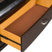 Make the most of your space with the contemporary style Avalon panel storage bed. The dark truffle finish is accented by black leather on the sleigh headboard and storage footboard. Crafted with poplar and pine solids with cherry veneers, this piece features bead molding, bow front drawers, and the step top on the footboard add an edgy look. Store clothing or blankets in the full extension drawers located in the footboard equipped with dust proofing to protect your belongings and antique pewter hardware to make for easy opening.