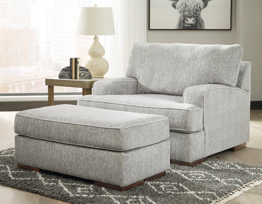 This oversized chair and ottoman set the scene for a modern space full of casual flair. In the on-trend slate color, the textured chenille with sol...