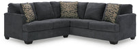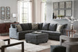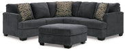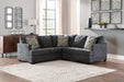 This sectional and ottoman package makes a stylish statement in modern design. Velvety soft upholstery is love at first touch, and its stunningly simple look is right at home in contemporary decor. The neutral gunmetal hue blends easily with any color scheme. Patterned accent pillows in complementary colors add bold contrast and a soft touch.