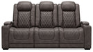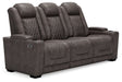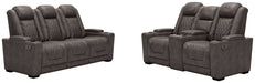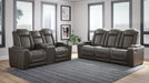 This power reclining package is proof of just how far recliners have come when it comes to form and function. Ultra cool and contemporary in trendy gray, this fully loaded set makes it so easy to make home your haven. Dressed to impress with diamond stitching inspired by sports car interiors, it’s covered in a fabulous faux leather with pebbled effect for authenticity. High-tech advancements include a one-touch power control with Easy View™ adjustable headrest and USB plug-in.