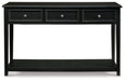 A relaxed take on casual traditional design, this sofa table strikes a simply chic pose with a casually cool sensibility. Three smooth-gliding drawers and a convenient open shelf with planked design keep essentials close at hand. What a welcome addition to a living room or entryway.