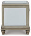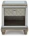 Glamorous, chic and sophisticated. This rectangular end table is made with a metallic silvertone finish, inset beveled mirror panels and drawer pulls adorned with faux crystals. No matter how you style it, this table is a stunning addition to your contemporary decor.