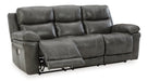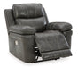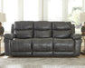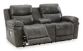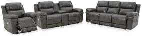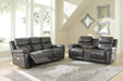 When you curl up in this power reclining sofa and loveseat package featuring adjustable headrests, you won't want to get up. It has genuine leather throughout the seating areas, in an easygoing charcoal gray hue that pairs up comfortably with most color schemes. This cozy set will be your go-to spot for watching TV, reading, or just closing your eyes and drifting off to sleep. Perfectly positioned cushions and overstuffed pillow top arms allow unparalleled relaxation. With a look that turns heads, this power pair includes extended ottomans for enhanced comfort, and adjustable headrests for a primo view of the TV even when you're fully reclined. Each piece is a dual-sided recliner: the sofa has a stationary middle seat, and the loveseat has a lift-top console with a storage compartment and cup holders.