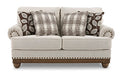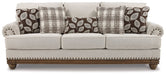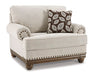 True classic character comes to life in this oversized chair and ottoman. Setback pleated roll arms and warm brown exposed frame with bun feet are richly traditional. Covered in a plush wheat-tone upholstery with herringbone weave, the chair includes a reversible seat cushion for comfort and durability. Bronze-tone jumbo nailhead trim and a botanical patterned pillow in earthy brown perfect the aesthetic.