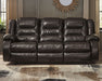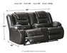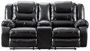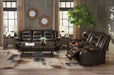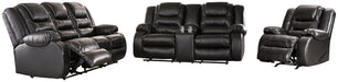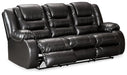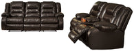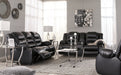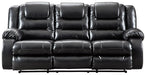 When it comes to comfort, style and value, this faux leather reclining sofa and reclining loveseat in black rocks. Tailored for feel-good flair, its fashion-forward bustle back design is enhanced with sculpted padding on the headrest for cradling support. Channel cushioning along the sides flows into thick, wrapped pillowtop armrests that are truly over the top. And while it might look like you broke the bank, a sumptuously soft leather-like fabric keeps indulgence well within budget.