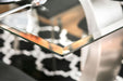 Graceful curves durably support the wide, rectangular glass top. The elliptical metal posts feature beautiful satin plated powder coating, matching the metal chair frames. Relax in style as the padded microfiber cushions offer comfort while the black upholstery complements the black finished base.