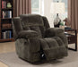 Engulf yourself in soft champion fabric and sink into the plush foam cushions of this brown glider recliner. Oversized head and armrests provide deep pockets of comfort while the convenient reclining feature provides a relaxing pose. Crafted for dedicated comfort, this functional glider recliner will leave you rested like never before.