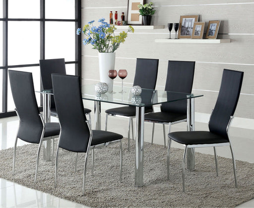 Furniture of AmericaIn stockLeatherette seating sets off this modern chrome and glass contemporary dining set. Bold design and modern details make this great for the urban kit...