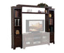 The Halden collection transitional style will blend masterfully in your living room area. This set features a shelf bridge with light function, and its two side piers offer plenty of space to keep entertainment components or your favorite decorative accessories. Carefully constructed from selected wood and veneers in rich Merlot Finish giving this piece a stunning and sleek appeal.