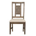 Details delight with the Artisan Prairie optional trestle table set. Crafted of rubberwood solids with split heart white oak veneers, this set features a wire brushed aged oak finish with gray dusty wax and consists of the trestle table and four lattice back side chairs. The trestle table has a planked top with canted corners and features an 18” self-storing removable leaf. This table is anchored by two pedestals with fretwork gird overlays that are connected with a center trestle. The chairs have a grid overlay design on the back and have a padded upholstered seat in a cream chenille fabric. They have tapered legs and nylon chair glides to protect your flooring. Create a natural feeling in your home with the Artisan Prairie collection.