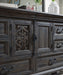 - Two Wood Doors With Carved Scrollwork Details On Reversible Door Fronts. One Adjustable Wood Shelf Behind Doors For Additional Storage