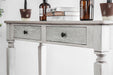 Introduce a bit of rural charm to your home. The carved Remington styled legs are a classic component of country styled furniture, here they come to life. The little drawer pulls reveal a handy storage space for small keepsakes and a convenient spot to store everyday used things like remotes. This wooden table comes finished in a handsome antique white, the wood grain pops at every twist and turn of the piece.