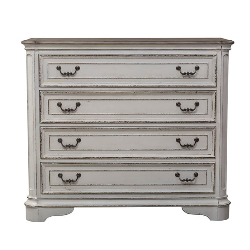 Magnussen FurnitureIn stockA fresh Weathered White finish on cathedral ash veneers and hardwoods contrasts simple Weathered Bronze pulls to create timeless comfort in Raelynn...