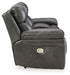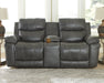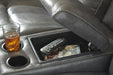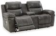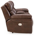 When you curl up in this power reclining loveseat with console and adjustable headrest, you won't want to get up. Its combination leather and faux leather upholstery comes in a neutral brown chocolate hue that pairs up comfortably with most color schemes. This cozy loveseat will be your go-to spot for watching TV, reading, or just closing your eyes and drifting off to sleep. Perfectly positioned cushions and overstuffed pillow top arms allow unparalleled relaxation. With a look that turns heads, this reclining loveseat has an extended ottoman to enhance comfort, and an adjustable headrest for a primo view of the TV even when you're fully reclined.