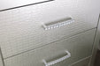 A touch of Old Hollywood reserved for the high-fashion starlet. Stealing the show with its glamorous good looks and upscale attitude, this nightstand is red carpet style made highly affordable. Distinctive elements include a silvertone metallic finish, chrome-tone pulls with encrusted faux crystals and faux shagreen drawer fronts for a rich textural twist.