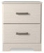 With its clean-lined look and modern attitude, this nightstand is a fresh style awakening. A crisp, white hue over subtle replicated wood grain easily complements other furniture finishes. Smooth drawer fronts with antiqued pewter-tone handles complete the aesthetic.