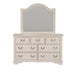 Enhance your room with this timeless Bayside panel bed and dresser and mirror kit, creating a shabby chic interior that all homeowners love. Crafted of pine solids and acacia veneers, this kit is unique with its antique white finish accented by heavy wire brushing. The bed features chamfered posts, an arched cap rail, planed panels offering dimension, bolt on rail system and center supported slat system, ensuring reliability and longevity. The dresser features full extension drawer glides for easy access to storage, fully stained interior drawers, bead molding, chamfered pilasters, wood framed drawer fronts, bracket feet, and is accented by antique pewter bail hardware. The mirror is elegantly arched with beveled glass, creating dimension.